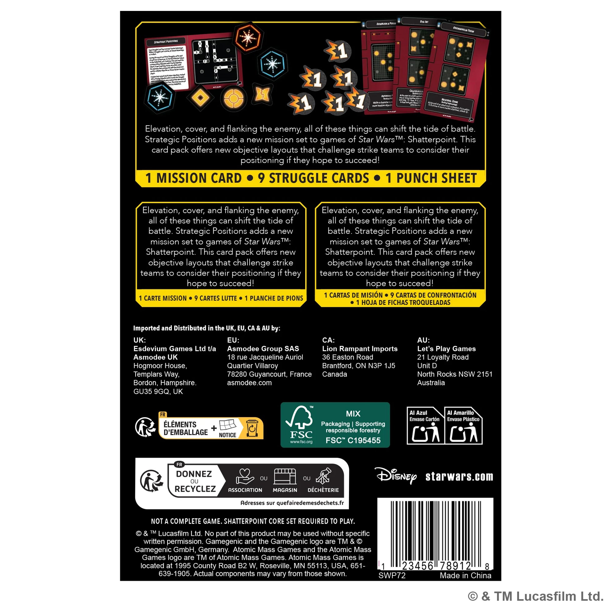 Strategic Positions adds a new mission set of 9 cards (3 Struggle I, II, and III) to games of Star WarsTM: Shatterpoint. This card pack offers new objective layouts that challenge strike teams to consider their positioning, including rules for Tactical Advantages that allow players to unlock potent bonus abilities for certain units based on the active mission card.